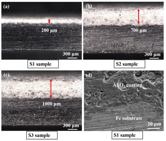 The single faced coating composites with different thickness of Al2O3 coating: (a–c) optical photographs; (d) SEM image of S1 sample.