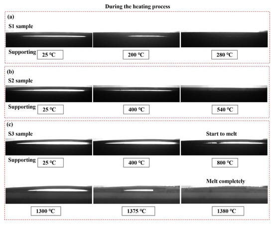 In-situ recorded images of the single-sided coating samples during the heating process: (a) S1 sample; (b) S2 sample; (c) S3 sample.