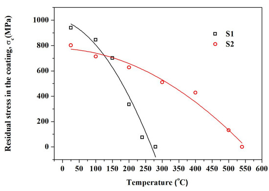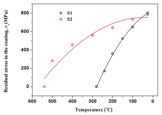 Temperature dependence of the residual stress in the coating of S1 and S2 samples during the heating process.