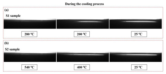 Deformations of S1 sample and S2 sample during the secondary cooling process: (a) S1 sample; (b) S2 sample.