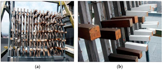 Figure 1 shows images of the experimental testing rack and the exposed samples. The samples were oriented with their tangential faces on the upper side and had a 10° backward slope to promote water ingress into the tenon–mortise joint, as a means of accelerating biodegradation [19].