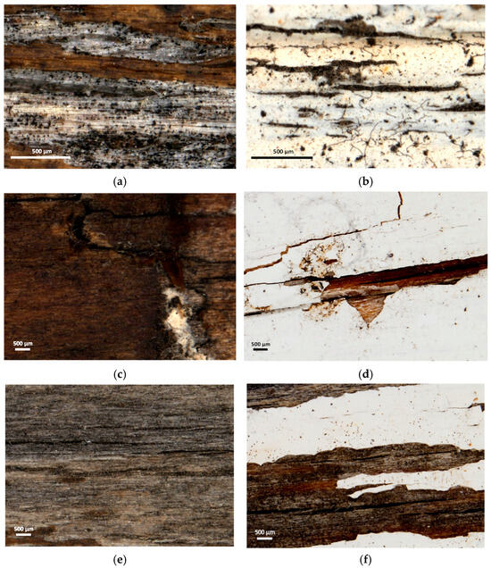 Figure 2 illustrates the degradation effects on the coated wood surfaces, as revealed by a microscopic evaluation of the upper faces of the test samples. For example, cracks in the wood and coatings, as well as areas with partial or total loss of the coating films (Alk1) and flaking areas of the films (Alk2), were present. Coating the wood with the two types of alkyds did not prevent, but only delayed, the growth of mold fungi, which was visible as black dots and filaments. This attack often results in localized degradation and/or microfissuring of the coating film, leading to further flaking (Figure 2a,b). Some decay-affected areas were detected for all categories of coated samples, more frequently close to the tenon area, which was not treated or coated (Figure 2c), but also along the tenon (Figure 2d). The weathered appearance of wood after seven years outdoors was also highlighted in the areas with coating film loss. This is evidenced by the rough surface, defibration, as well as deep wood cracks, combined with fungal growth spots. (Figure 2e,f).