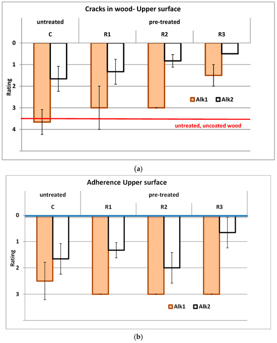 Influence of resin pre-treatments on the cracking of wood substrate (a) and adherence of the coating films (b) after 7 years of exposure. Note: Original rating scales for cracks (0–4) and adherence (0–3) were employed, blue line—initial adherence (grade 0).