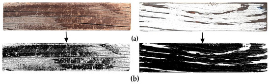 Examples of ImageJ analysis of coating film loss for two samples covered with alkyd stain (Alk1) and white enamel (Alk2)—(a) original image and (b) the same image in a binary system.