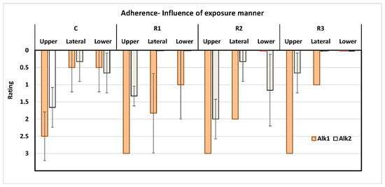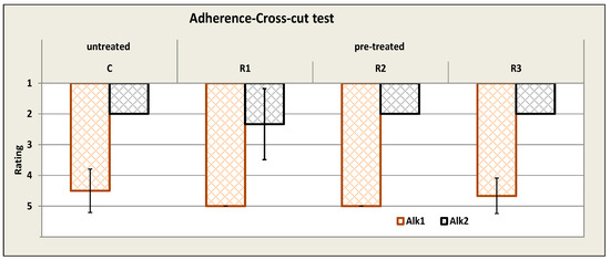 The adherence of (Alk1) reached the lowest rating of 3, meaning a visible degradation at the end of the test (Figure 7a). The adherence of the (Alk2) coating film for all tested samples ranged from good to medium (below 2), as shown in Figure 7b.