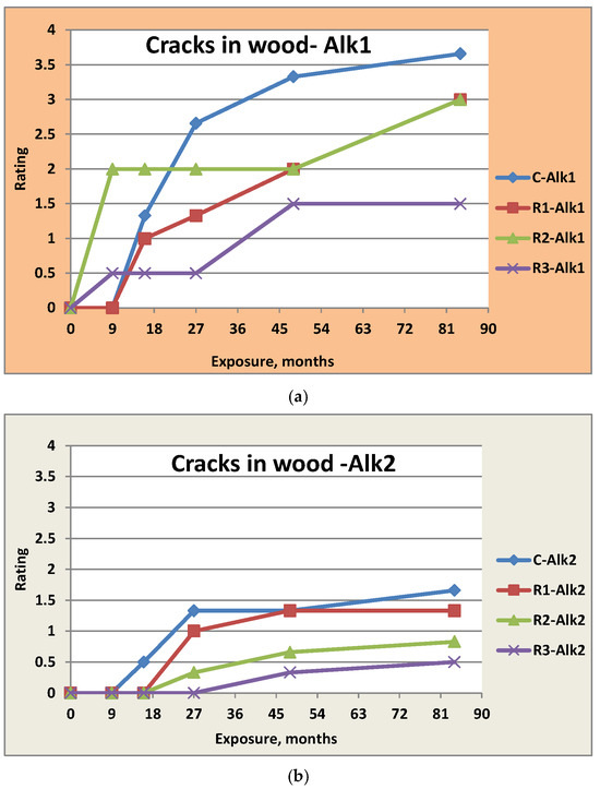 Wood substrate cracking and adherence causing a loss of coatings evolved in time during the 7 years of exposure, as illustrated in Figure 6, based on data from periodical evaluations after 9, 16, 27, 48, and 84 months (7 years) of exposure. Generally, the cracking at the macroscale diminished when the wood substrate was pre-treated before coating, but the cracking evolution pattern was dependent on the type of resin and influenced by the type of coating (Figure 6a,b). The best result was registered for wood pre-treated with alkyd-polyurethane resin R3, coated with (Alk2), where cracking was noted only after 27 months of exposure, later than in the rest of the samples.
