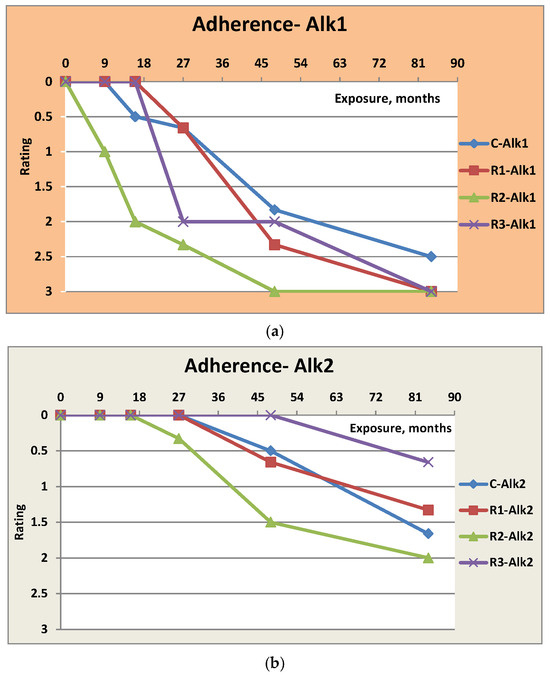 The evolution of coating adherence over time for the two alkyds tested (Alk1 (a) and Alk2 (b)) after periodic assessments (9, 16, 27, 48, and 84 months).