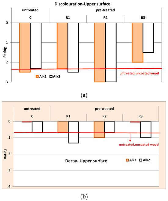 In support of the above statements, the visual assessment of biodegradation confirmed that extensive discoloration, exceeding grade 2, was registered for most of the samples, demonstrating that the coating films applied could not provide long-term protection against mold and stain fungi. Maximum conventional grade (3) of discoloration was recorded for the samples pre-treated with R2. The treatment with resin (R3)-alkyd polyurethane resulted in less discoloration than untreated and uncoated wood, with a rating below 2, compared to the other treatments (Figure 9a).