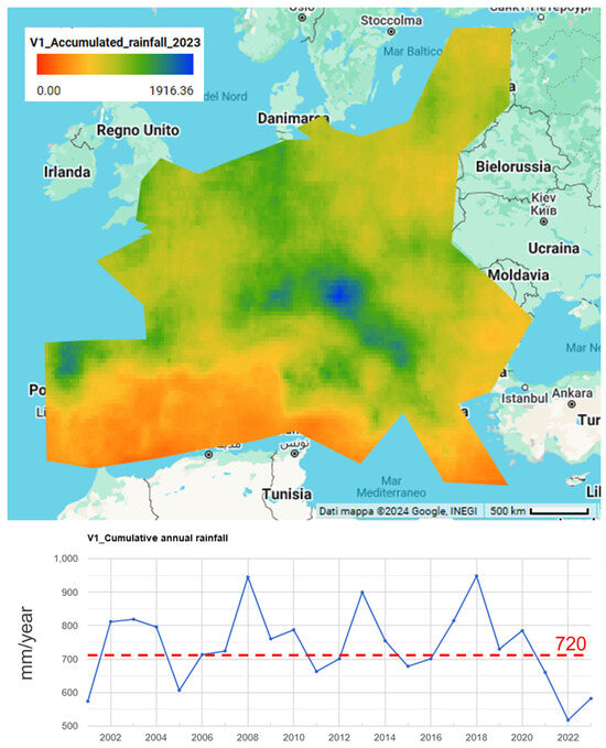 Art-risk 5 heatmap of rainfall in 2023 (top). The central-southern Europe area has been considered to estimate the average cumulative annual rainfall values in the graph (below).