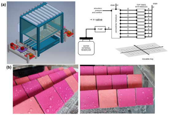 (a) Design of the rain chamber (left), hydraulic scheme of the roof reservoirs and movement scheme of the tray along the X-Y axis (right); (b) painted mock-ups placed inside the chamber on the PMMA sample holder inclined by 45°.