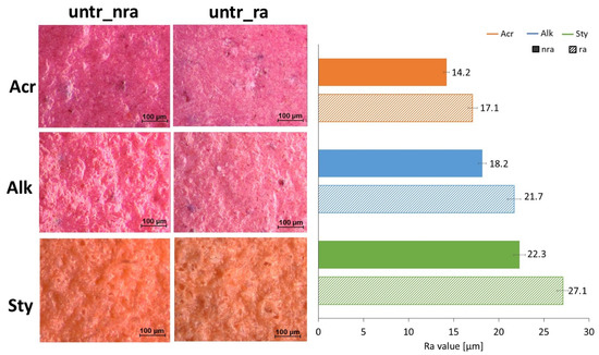 Through optical microscopic, it was possible to point out some other signs of degradation after rain ageing. The Alk and Sty paints exhibit a reduction in surface gloss, and a different surface roughness (Figure 4). This effect is most probably connected to rain erosion, resulting from both the mechanical impact of water droplets and chemical interactions between rainwater and the surface materials, that can cause a partial washing away of the surface organic binder. From the evaluation of the roughness values (Figure 4), it is evident that for all three paints, there is an increase in surface roughness values, slightly greater for Sty paint followed by Alk paint and Acr paint.