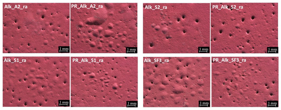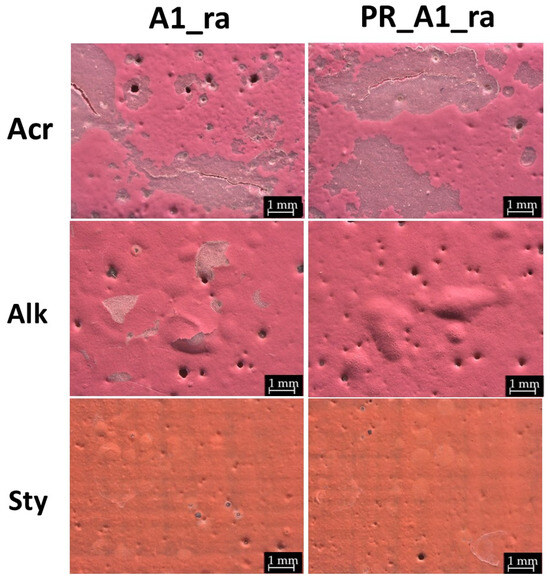 The morphological analysis of the aged samples treated with protective coatings clearly reveals that the degradation patterns are strongly influenced by both the chemical nature of the paint and the type of protective product applied. Each paint-coating combination responds differently to rain exposure, underlining the importance of material compatibility in determining long-term performance. For instance, the alkyd paint treated with the A1 acrylic coating exhibited severe blistering and partial detachment of the protective film, particularly in the absence of a primer layer (an effect not observed with other paint types or coatings). This highlights how specific interactions between the coating, the paint matrix, and the substrate can critically affect the durability of the protective system. The following sections present in detail the experimental results that support these observations, highlighting the specific degradation patterns and protective behaviours associated with each paint-coating combination. A1 coating shows the greatest signs of degradation, mainly for Alk paint, followed by Acr and Sty paints (Figure 5). In the case of Alk paint, the rain caused the blistering of the paint film from the substrate, as well as the detachment of A1 coating from the paint (as evident in the grey areas in Figure 5 Alk_A1_ra and in Figure S2). Interestingly, this effect is particularly visible in the sample without primer showing a distribution mainly in the central part of the sample. In contrast, for samples with primer, paint blistering from the substrate is still observed (mainly for Alk paint), while coating detachment is practically absent (except in Acr paint). In Sty paint, only slightly more opaque areas are observed.