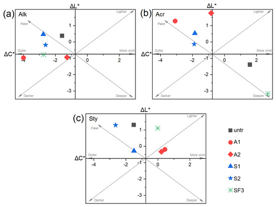 Colour changes in the ΔL* (luminosity difference) and ΔC* (chroma difference) colour plane, measured on treated mock-ups for (a) Alkyd, (b) Acrylic and (c) Styrene-acrylic paints. Δ values are calculated before and after rain ageing.