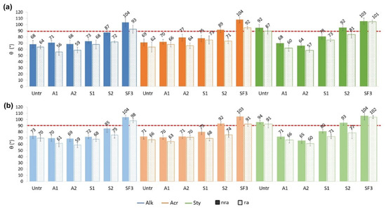 Comparison of contact angle values (θ) before and after rain ageing divided by (a) without primer, (b) with primer and type of paint: Alk (blue columns), Acr (orange columns), Sty (green columns).