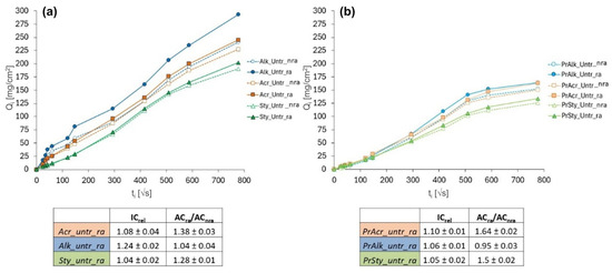 Water absorption curves as a function of the water absorbed per surface unit (Qi) versus the root square of exposure time (ti) of: (a) Untreated mock-ups without primer, and (b) Untreated mock-ups with primer. Corresponding ICrel and AC values are reported under each graph.