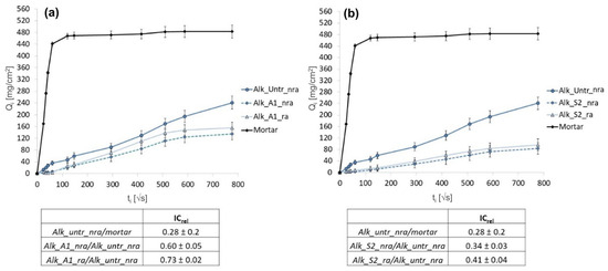 Capillary water absorption curves of alkyd mock-ups treated with: (a) A1; (b) S2. The black plain line represents the absorption of cement mortar mock-ups. Corresponding ICrel values are reported under each graph.