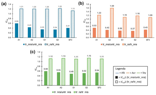 ICrel values divided by type of paint: (a) Alk, (b) Acr, (c) Sty. The values were calculated over the treated unaged/untreated unaged sample (tr_nra/untr_nra, dashed columns) and treated aged/untreated aged sample (tr_ra/tr_nra, dotted columns) of the three paints.