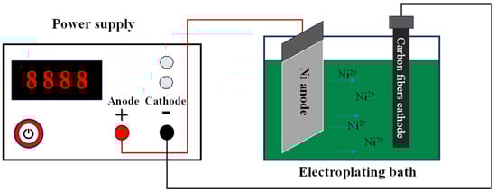 The process of electroplating Ni coatings on the carbon fiber surfaces is shown in Figure 1. First, a specific quantity of nickel sulfate and boric acid reagent is dissolved in deionized water, and the reagent is thoroughly stirred to dissolve it completely, to create the electroplating solution. Subsequently, the prepared electroplating solution is transferred into the electroplating tank. The carbon fiber cathode is positioned at one extremity of the tank and connected to the negative terminal of the power supply, while the Ni anode is placed at the opposing extremity and connected to the positive terminal. A constant voltage was applied between the carbon fiber cathode and the Ni anode throughout the electrodeposition process. Upon completion of the plating, the coated carbon fibers were extracted, rinsed thoroughly, and subsequently placed in a vacuum desiccator for drying prior to further performance characterization.