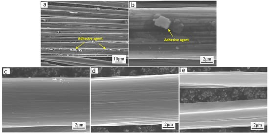 To mitigate mechanical damage during packaging and transportation, carbon fibers are typically coated with a protective adhesive layer during manufacturing. Thus, a thermal treatment process must be applied to carbon fibers before electroplating to remove the protective adhesive layer, ensuring homogeneous distribution and optimal solution contact during subsequent electrodeposition [25]. Figure 2 shows the microscopic morphology of the carbon fiber surface obtained under different heat treatment conditions. It is evident that varying heat treatment temperatures result in distinct surface alterations for carbon fiber. Figure 2a,b display the surface microstructure of pristine carbon fibers prior to thermal treatment. Figure 2a,b reveal that the untreated carbon fibers exhibit a tightly bonded morphology, with particulate matter observed on the fiber surfaces. These surface particles likely originate from localized aggregation of the sizing agent. The sizing agent on carbon fiber surfaces not only hinders sufficient contact between the fibers and electroplating solution, but also adversely affects the electrical conductivity during the electroplating process [26]. Figure 2c shows the microstructure of the carbon fiber surface after a 30 min heat treatment at 300 °C in an atmosphere environment. Microscopic analysis reveals that the fiber surface exhibits significant cleaning, with distinct longitudinal striations along the fiber axis, suggesting removal of surface sizing agents. Figure 2d shows the microstructure of the carbon fiber surface after a 30 min heat treatment at 500 °C in an atmosphere environment. Similarly, the carbon fiber surface exhibits an exceptionally clean morphology, devoid of any detectable impurities. However, compared to Figure 2c, the surface striations of the carbon fiber are deeper. Figure 2e shows the microstructure of the carbon fiber surface after a 30 min heat treatment at 700 °C in an atmosphere environment.