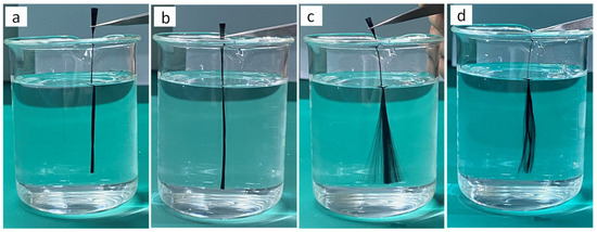 Dispersibility of carbon fibers in aqueous solutions under different heat treatment conditions: (a) as-received carbon fiber; (b) carbon fiber heat-treated at 300 °C; (c) carbon fiber heat-treated at 500 °C; (d) carbon fiber heat-treated at 700 °C.