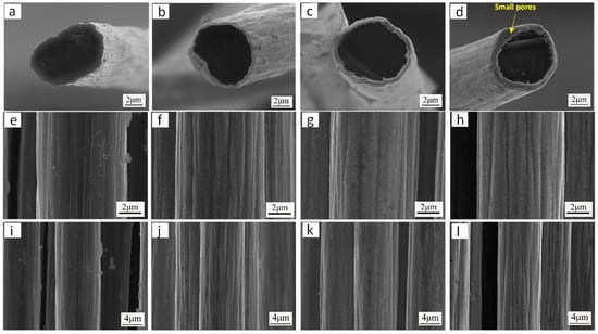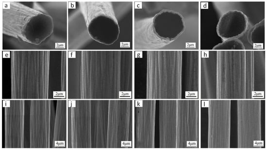 To systematically investigate the influence of deposition voltage (varied from 3 to 9 V) on the microstructure of Ni coatings, a series of electrodeposition experiments was conducted under controlled conditions: pH 4.1, nickel sulfate concentration 122 g/L, bath temperature 25 °C, and deposition duration 60 s. Coating thickness was quantitatively characterized for each voltage condition. Figure 6 shows the microstructure of Ni coatings obtained under different deposition voltage conditions. As seen in Figure 6a,e,i, a thin layer of Ni is formed on the carbon fiber surface when the deposition voltage is 3 V. The Ni coating’s shape is not entirely evident. The coating thickness, as determined by measurement and computation, was roughly 52 nm. The reason for this is that at low voltages, Ni2+ acquires electrons slowly, which results in a poor nucleation rate. This makes it harder for Ni to deposit on the carbon fiber surface, which leads to a thinner coating. As seen in Figure 6b,f,j, a uniform and complete Ni coating forms around the carbon fiber when the voltage is raised to 5 V. The coating is firmly bound to the fiber and has a thickness of around 470 nm. When the voltage was further increased to 7 V, the Ni coating continued to uniformly and completely cover the fibers, with a coating thickness of approximately 645 nm, as shown in Figure 6c,g,k. As demonstrated in Figure 6d,h,l, deposition at 9 V resulted in the formation of localized porosity within the Ni coating. This morphological defect can be attributed to the hydrogen evolution reaction under high-potential conditions, where gas bubble incorporation during electrodeposition generates void structures. Measurement of the coating thickness shows a value of approximately 693 nm. Therefore, it was found that the deposition voltage affects the thickness of the Ni coating. Furthermore, both excessively high and low applied voltages fail to produce optimal coatings on carbon fibers. Systematic characterization reveals that maintaining the deposition voltage within the range of 5–7 V yields coatings with better structure.