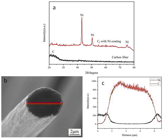 Component analysis of Ni coating on carbon fiber surface: (a) Ni coating XRD analysis; (b,c) EDS line scan analysis of Ni coating cross-section.
