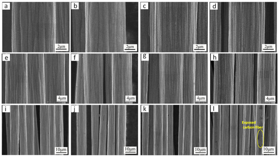 To systematically investigate the influence of nickel sulfate (NiSO4) concentration (ranging from 42 to 162 g/L) on the microstructural evolution of electrodeposited Ni coatings, a series of controlled electroplating experiments was conducted while maintaining the following constant parameters: pH 4.1, applied potential 6 V, bath temperature 25 °C, and deposition duration 60 s. Figure 4 shows the microstructure of Ni coatings obtained under different nickel sulfate concentrations. When the concentration of nickel sulfate is 42 g/L, as shown in Figure 4a,e,i, a uniformly smooth Ni coating is formed on the carbon fiber surface, although it is rather thin in thickness. This is because low concentrations of nickel sulfate result in low quantities of Ni2+, which causes a slower rate of Ni deposition on carbon fibers and a thinner nickel coating. When the nickel sulfate concentration is increased to 82 g/L, the Ni coating deposited on the carbon fiber surface not only is smooth and uniform, but also has a clear outline and is tightly bonded to the carbon fiber, as shown in Figure 4b,f,j. On the one hand, heat treatment enables complete contact between the carbon fiber filaments and the electroplating solution. However, an adequate amount of Ni2+ can also speed up the Ni coating’s deposition. When the nickel sulfate concentration increased to 122 g/L and 162 g/L, as shown in Figure 4c,d,g,h,k,l, not only was the Ni coating on the carbon fiber surface smooth and uniform, but its thickness also increased. According to the analysis, the thickness of the Ni coating is influenced by the content of nickel sulfate in the electroplating solution. This could be because varying concentrations of nickel sulfate differ in the rate at which Ni atoms are deposited. Therefore, the concentration of nickel sulfate must be higher than 42 g/L to achieve a uniform, smooth Ni coating of a specific thickness on the carbon fiber surface.