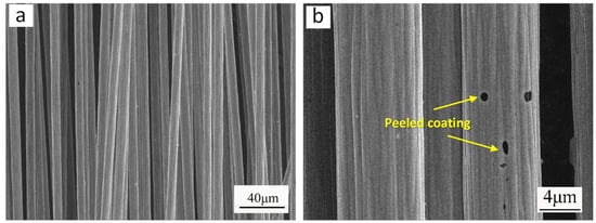 The interfacial adhesion between the carbon fiber and coating was evaluated using thermal shock testing. The procedure consisted of (1) immersing the coated carbon fiber in boiling water for 20 min, (2) rapidly transferring it to ice water (0–5 °C) for 5 min, and (3) repeating this cycle six times. Post-test, the coating’s surface morphology was examined, and the bonding strength was assessed based on the degree of coating delamination. Figure 8 shows the microstructure of the Ni coating on the surface of carbon fiber before and after thermal shock. It was observed that after thermal shock testing, only minor delamination occurred in the Ni coating on the carbon fiber surface, while the majority of the coating remained intact and uniformly adhered to the substrate. Mass measurements of the Ni coating on carbon fiber surfaces before and after thermal shock testing revealed a minimal mass loss rate of merely 1.1%, demonstrating excellent interfacial adhesion between the Ni coating and carbon fiber.