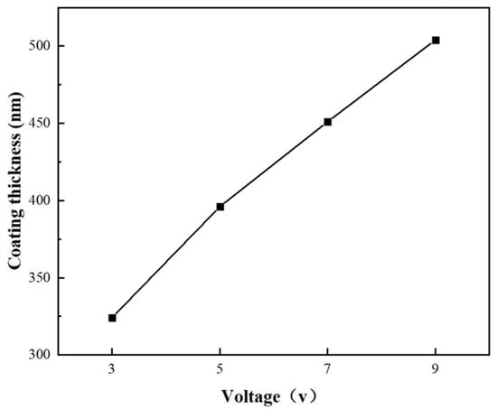The thickness of the Ni coatings was examined after they were created under various voltage circumstances (3–9 V) in order to examine the impact of the deposition voltage on the coatings. Figure 10 shows the relationship curve between Ni coating thickness and deposition voltage. It can be seen from the figure that the coating thickness varies almost linearly with the deposition voltage. Derived from Faraday’s Law, the coating thickness correlates with applied voltage through the following equation [30]: