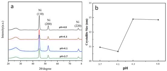The crystallite size measured from diffraction peaks does not represent the true crystallite size, but it can serve as a reference for relative comparison. In this work, based on the formula mentioned above, the crystallite size was calculated using the full width at half maximum (FWHM) of the (110) diffraction peak. Figure 11 shows the effect of the pH value of the electroplating solution on the crystallite size of the Ni coating. Figure 11a shows the XRD patterns of Ni coatings obtained under different pH conditions. Figure 11b shows the crystallite size of the Ni coating obtained by calculation. It was found that the Ni crystallite size was smaller at pH 3.7 and 4.1, while larger crystallite sizes were obtained at pH 4.3 and 4.8. This result is consistent with the observed microstructure of the Ni coatings shown in Figure 7. This is because during the electroplating process, in addition to the redox reaction of Ni2+ at the electrode, the following side reactions also occur:
