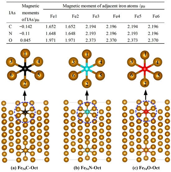 Schematic illustration of O-site IAs (C, N, or O) and their adjacent iron atoms in the BCC Fe supercell. The top table lists the magnetic moments of Fe atoms (μB). The Fe1/2 atom in (a–c) represents the first-nearest-neighbor (1NN) atom to IAs, and Fe3/4/5/6 represents the second-nearest-neighbor (2NN).
