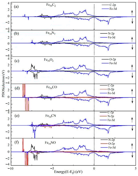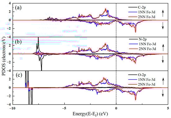 To understand detailed bonding characteristics, the projected density of states (PDOS) of O-site IAs and their neighboring iron atom (1NN Fe and 2NN Fe) in Fe54C, Fe54N, and Fe54O lattices is computed, as indicated in Figure 3. There are no energy gaps near the Fermi level, indicating the metallic properties of the supercells. PDOS shows that the hybridization between Fe (1NN Fe and 2NN Fe) 3d states and C/N/O 2p states is strong in both the Fe-lattices, which is in accordance with other calculations [34,42]. By contrast, it can be seen that the hybridization between Fe 3d and C 2p is stronger than that between N and O, and the Fe-C bond presents significant covalent bond properties. O 2p and Fe 3d exhibit obvious isolated peak hybridization, so the Fe-O bond has distinct ionic properties. The hybridization between C 2p and Fe 3d occurs at −6.4 eV in Fe54C (Figure A3), the hybridization between N 2p and Fe 3d occurs at −7.5 eV in Fe54N, and the hybridization between O 2p and Fe 3d occurs at −8.5 eV in Fe54O. A significant asymmetry in the spin-up and spin-down electron densities reveals the ferromagnetic nature of BCC Fe supercells.