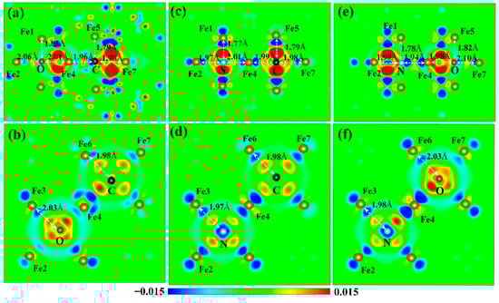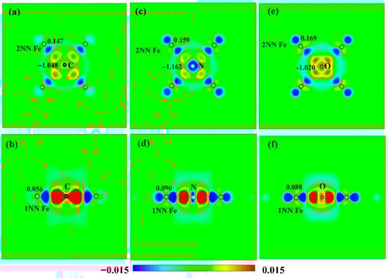 The charge density difference (a,c,e) of the <001> plane and the charge density difference (b,d,f) of the <100> plane in Fe54C, Fe54N, and Fe54O, respectively. It plotted from −0.015 (blue) to 0.015 (red) e/Å3. Bader charge population denotes C/N/O IAs and their neighboring Fe-atom.