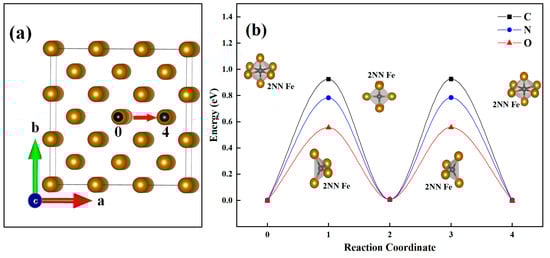 The diffusion behavior of IAs has a significant impact on the clustering, segregation, and precipitation of solutes within steel [36]. Therefore, it is essential to conduct an in-depth study of the diffusion behavior of IAs. To analyze the diffusion of single IAs in the BCC Fe lattice, the CI-NEB method was employed to optimize the best migration path for these atoms moving from one O-site to a neighboring O-site in the BCC Fe lattice, as illustrated in Figure 5a.