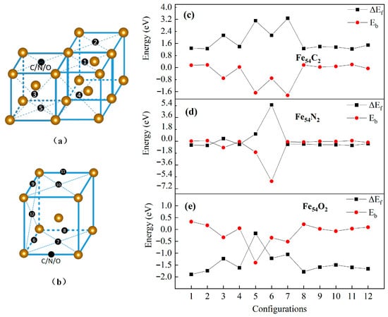 Formation energy (ΔEf) and binding energy (Eb) of two homo IAs occupying different configurations of O-sites. (a) and (b) the different configurations of two homo IAs; (c) Formation energy (ΔEf) and binding energy (Eb) of Fe54C2; (d) Formation energy (ΔEf) and binding energy (Eb)of Fe54N2; (e) Formation energy (ΔEf) and binding energy (Eb)of Fe54O2.