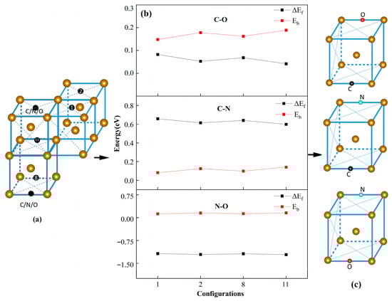 Formation energy (ΔEf) and Binding energy (Eb) of two hetero C/N/O interstitial atoms occupying different configurations of O-sites, as shown in Figure 7a. The units of all energy are eV.