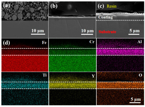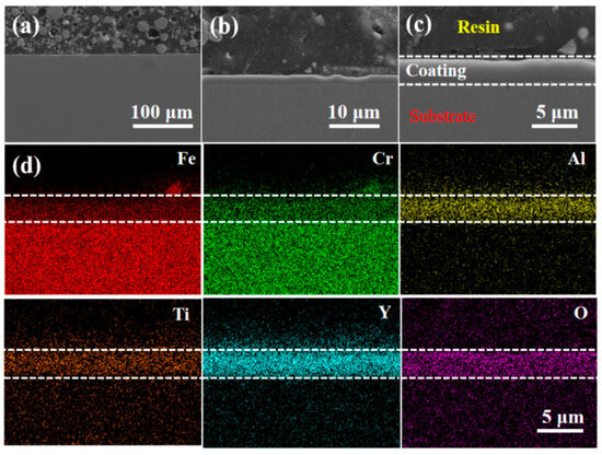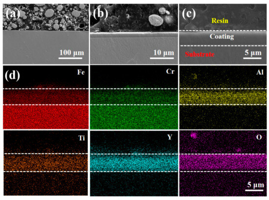 SEM analysis of the as-deposited FeCrAlTi-ODS (S2) alloy coating (a–c) cross-sectional SEM images; (d) cross-sectional EDS mapping.