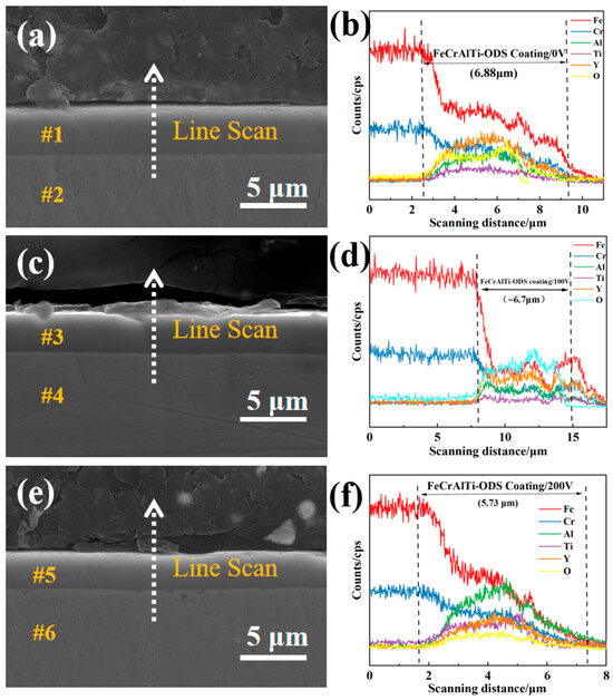 Cross-sectional morphologies of FeCrAlTi-ODS coatings prepared under different negative bias voltages and corresponding EDS line. Scanning energy spectrum diagrams (a,b) S1 coating; (c,d) S2 coating; (e,f) S3 coating.