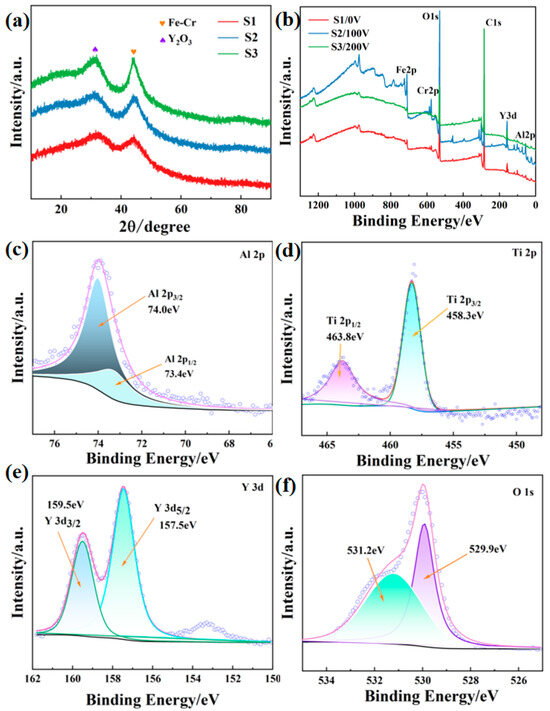 Figure 6b shows the XPS spectrum of FeCrAlTi-ODS alloy coatings prepared under different bias voltages. The presence of O, Y, Ti, Al, Fe, and Cr elements on the alloy coating’s surface verifies the successful application of the FeCrAlTi-ODS alloy coating onto austenitic stainless steel. To study the chemical states of various elements, the fine spectra of Al, Ti, Y, and other elements in the alloy coating prepared under 100 V bias voltage were analyzed. As Figure 6c shows, the binding energy of 74.1 eV for Al 2p1/2 and 73.30 eV for Al 2p3/2, indicating the presence of Al elements. As Figure 6d shows, 458.3 eV and 463.8 eV correspond to the binding energy of Ti 2p3/2 and Ti 2p1/2 respectively, indicating the presence of Ti. As Figure 6e shows, the electron binding energies corresponding to Y 3d5/2 and Y 3d3/2 at 157.5 eV and 159.5 eV indicate that Y primarily exists in the alloy coating in various forms [38]. The absence of a metal Y 3d peak at 155.6 eV suggests that the content of metallic Y in the film is below the detection limit. As Figure 6f shows, according to the XPS manual, the fine spectra of O 1s at binding energies of 529.9 eV and 531.2 eV correspond to the O-Y bond and physical adsorbed oxygen O2−, respectively. This indicates that there is a certain amount of adsorbed oxygen in the coating structure, which also suggests that the coating contains a significant amount of O elements. As the applied bias during the coating process increases, the content of O-Y bonds rises. Although the samples were prepared by Ar+ sputtering, the metal–ceramic coatings prepared under magnetron sputtering conditions inevitably contain adsorbed oxygen.