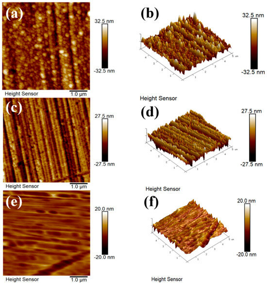 AFM 2D images and 3D surface images of FeCrAlTi-ODS coating prepared under different negative bias voltages (a,b) S1 coating; (c,d) S2 coating; (e,f) S3 coating.