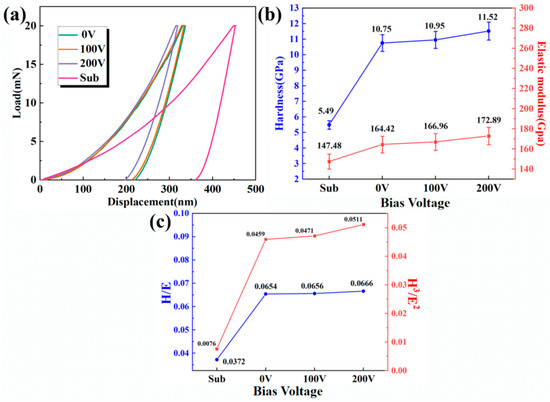Substrate and FeCrAlTi-ODS alloy coating prepared under different bias voltages. (a) nano-entation displacement-load curve; (b) H and E; (c) H/E and H3/E2.