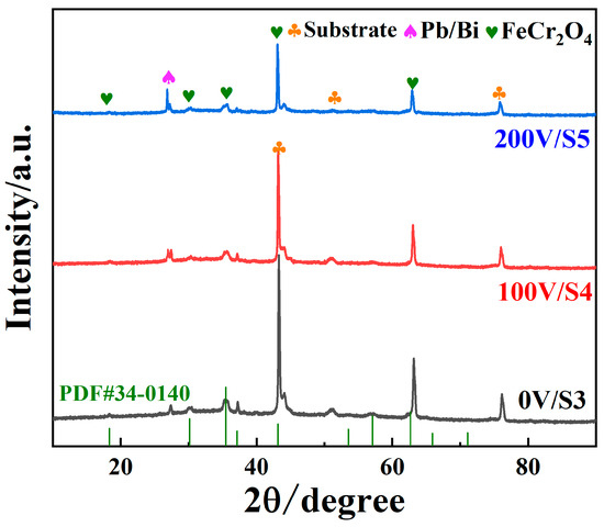 Research indicates that applying an alloy coating to stainless steel surfaces can efficiently shield the underlying material against corrosion by LBE [21,40,41]. To investigate the phase composition of the pattern surface following 100 h of LBE corrosion, as Figure 9 shows, GIXRD phase analysis was performed on the coating corrosion samples prepared under different bias voltages. According to the results, oxide formation occurred on the alloy coating’s surface. Other than the peak of removing the substrate elements, FeCr2O4 (PDF#34-0140) were mainly detected on the surface of the alloy coating, which is the composite oxide of Fe and Cr. Under the action of long corrosion, it is composed of Cr2O3 and Fe2O3, which has a good protective effect compared with the oxide of Fe and Cr. This indicates growth of coating surface oxides to prevent further oxidation of the substrate material. In general, the formation sequence of oxides is primarily related to Gibbs free energy, with alumina oxides preferentially forming compared to other observed oxides. However, the oxide growth primarily occurs through the outward diffusion of the coating’s metal elements; Fe and Cr elements in LBE solubility is low [42], its diffusion coefficient is relatively high, Al element atomic radius is larger, and serious lattice distortion leads to its slow diffusion. This impedes the diffusion of elements like Al and Ti, resulting in the higher mobility of Fe and Cr in liquid-phase LBE compared to Al and Ti [43]. Eventually, selective oxidation takes place as a result of varying diffusion rates among the alloy’s constituent elements [31].