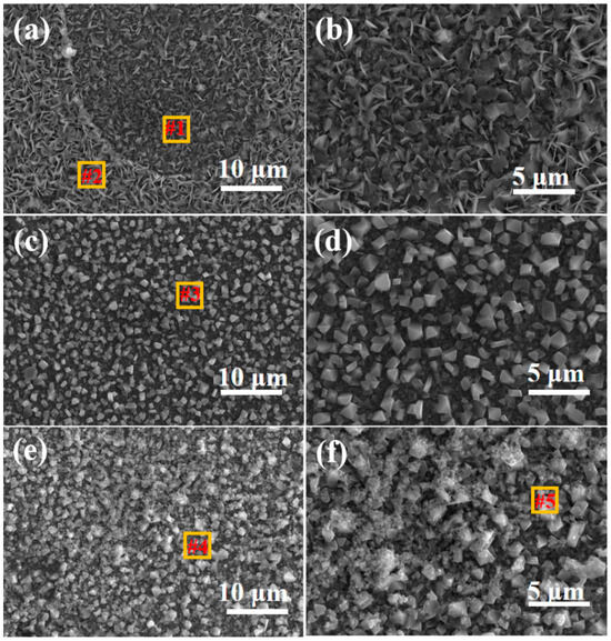 Figure 10 shows the SEM images of the surface of the prepared alloy coating after corrosion in LBE at 550 °C for 100 h. After a long period of LBE corrosion, a large number of granular oxides form on the surface. As Figure 10a,b shows, the S1 coating material is severely damaged. Its oxides have a flaky structure, and a large number of corrosion pits appear. There is a large accumulation of LBE residue that can further corrode the interior of the substrate along the generated holes, accelerating the corrosion process of the substrate and thus causing serious damage to the substrate. As Figure 10c,d shows, the coating prepared under a negative bias voltage of 100 V has the least LBE residue on its surface. The oxides are small in size and have a regular rhombic shape. After a long period of corrosion, the coating can still remain intact. As Figure 10e,f shows, the S3 coating surface forms relatively regular oxide particles. However, a large amount of LBE residue is present on the S3 surface, indicating that, after a long period of LBE corrosion, a large number of oxides of Pb and Bi alloys adhere to the surface of the S3 coating. The oxide particles in S2 and S3 coatings are different from those in the S1 coating, which illustrates the importance of applying a negative bias voltage during the coating preparation process.