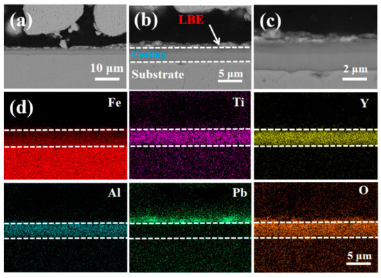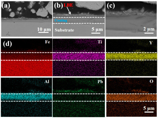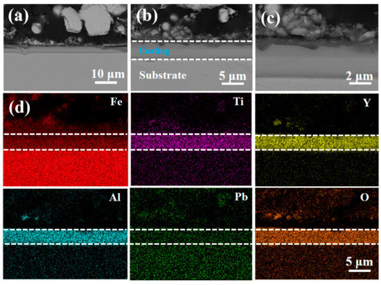 In order to observe the corrosion resistance of the alloy coatings prepared under different bias voltages to LBE, SEM and EDS were used to analyze the corrosion cross-sections of different samples. Figure 11a–c are SEM images of the cross-section of Sample S1 after being corroded by LBE. The outermost layer is the residual LBE. It can be observed that the coating structure remains intact, and no LBE residue is found in the substrate part. As Figure 11d shows, in the EDS mapping image, various oxides can be observed, including the oxides of elements such as Fe, Al, and Ti. There is a certain amount of lead oxide on the surface of the coating. The LBE does not penetrate into the substrate, indicating that the prepared alloy coating can effectively protect the stainless-steel substrate material.