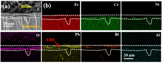 Figure 14 shows the cross-sectional SEM image and the corresponding EDS mapping image of the 316L austenitic steel base material after being corroded by LBE at 550 °C for 100 h. As Figure 14a shows, the surface of the base material is severely damaged, with a large area of corrosion pores appearing on the surface, and part of the surface of the base material is peeled off. As Figure 14b shows, there is an obvious penetration of the oxygen element on the surface of the base material. The penetration of the oxygen element into the interior of the base material will generate rapid oxidation channels, which will further accelerate the corrosion of the base material and seriously affect the service life of the base material, etc. The Ni element selectively penetrates and enriches on the surface of the base material, and the Pb element gradually dissolves into the interior of the base material [44]. An obvious oxide layer of Pb appears on the surface of the base material. The corrosion layer on the surface of the 316L austenitic steel base material is about 10 μm, and no dense oxide layer is formed on the surface of the base material to protect the base material.