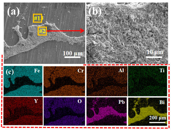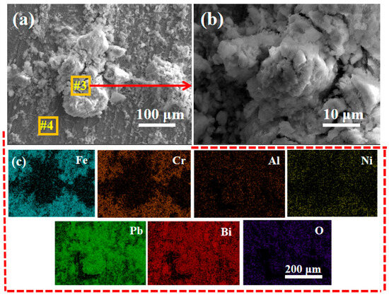 (a,b) SEM diagram of the residual substances on the surface of the S2 alloy coating after 100 h of corrosion with 550 °C LBE; (c) EDS mapping diagram of (a).