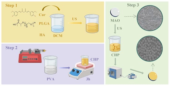 At room temperature (25 ± 2 °C), each organic phase was added dropwise (1 mL min−1) into 10 mL of an aqueous 3% (w/v) polyvinyl alcohol (PVA; Aladdin, Shanghai, China; Mw 17,600–26,400) solution under continuous magnetic stirring at 600 rpm. After complete addition, the resulting emulsions were sonicated for 6 min to achieve uniform dispersion of the organic phase within the aqueous phase, forming primary emulsions. The emulsions were then stirred at 600 rpm for 2 h to allow complete evaporation of DCM. Using this protocol, three micron coating formulations differing in PLGA content (50, 100, and 150 mg, corresponding to 50%, 100%, and 150% (w/w) relative to the initial Cur/HA mass), were prepared.