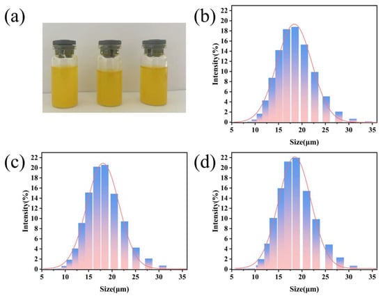Figure 3 provides a direct comparison of the macroscopic appearance and the corresponding particle size distribution profiles of CHP micron-scale coating prepared at different PLGA concentrations. As shown in Figure 3a, all three formulations present as homogeneous pale-yellow emulsions. The particle size data (Figure 3b–d) further elucidate the influence of PLGA concentration on dimensions.