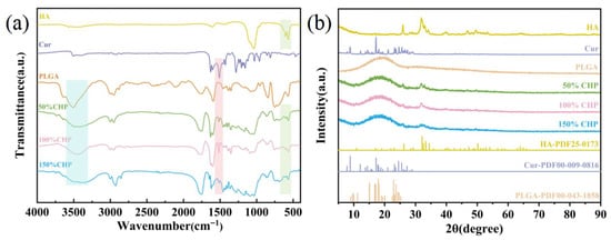 Figure 4a presents the FTIR spectra of CHP micron coating prepared at different PLGA concentrations. A broad absorption band centered at approximately 3490 cm−1 is ascribed to the O–H stretching vibration, primarily originating from PLGA. The peaks observed at ≈1601 cm−1 and ≈1514 cm−1 are characteristic of aromatic ring stretching, confirming the presence of curcumin. Absorptions at ≈1352 cm−1 and ≈1036 cm−1 correspond to C–O–C and C–O stretching vibrations within PLGA and hydroxyapatite (HA), respectively. The distinctive peak at ≈565 cm−1 is attributed to the ν4 bending mode of PO43−, unequivocally demonstrating the incorporation of HA.