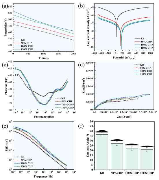 The open-circuit potential (Eocp) curves depicted in Figure 5a demonstrate that CHP-treated Ti-MAO alloys exhibit markedly higher potentials than the KB-Ti-MAO control. According to the Eocp data, the maximum potential of 526.2 mV is achieved when the CHP content is 100%, representing an increase of 41.77 mV relative to the KB-Ti-MAO specimen. These results indicate that CHP treatment significantly reduces the corrosion propensity of the Ti-MAO alloy.